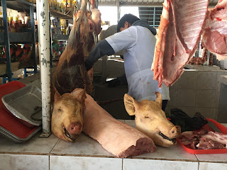 | This is a pig head and ribs from a cow. The butcher is portioning a cow in the background. |