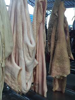 | These dripping sheets of skin are the stomach lining of a cow. |