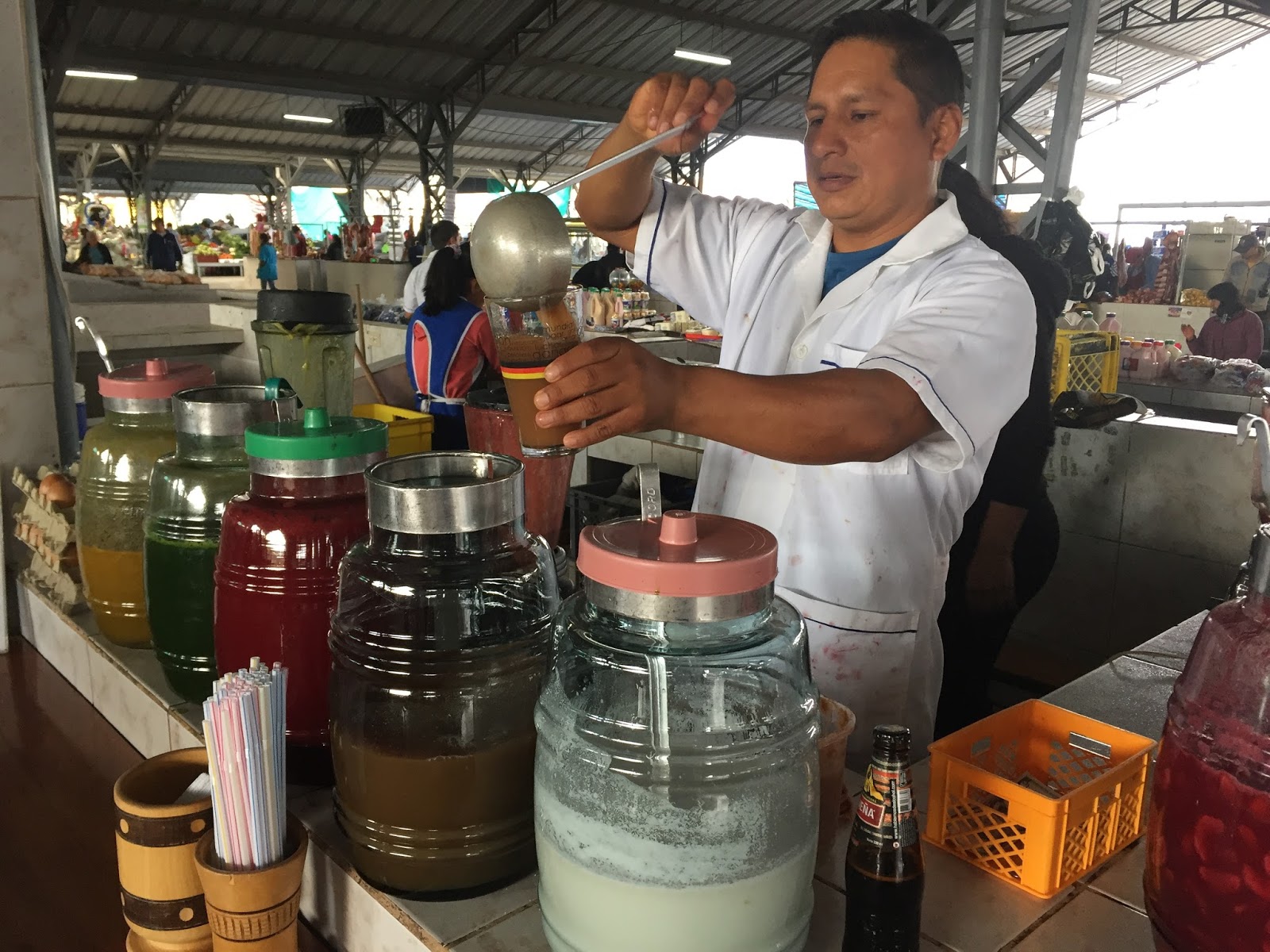 A juice bar in the middle of the market. He is pouring my tamarinda juice. |