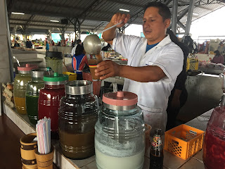 | A juice bar in the middle of the market. He is pouring my tamarinda juice. |