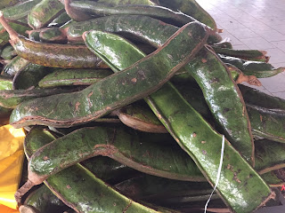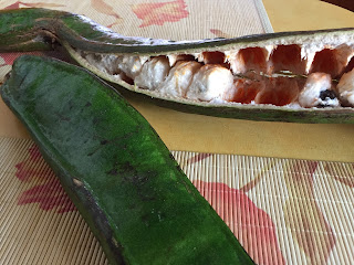 | These are guabas. They are a large variety. I’ve seen smaller ones hanging from a tree. I had to buy one to take it home to find out what to do with it. |