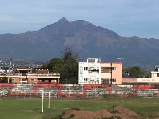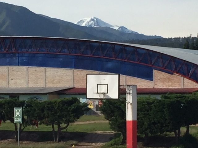 On clear days, snowcapped Volcan Cayambe is a rare and special sight in the distance above the swimming pool and basketball courts. |