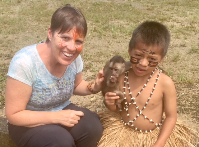 | First, we visited a village of the Shuar people where our faces were painted and we participated in a traditional dance. |