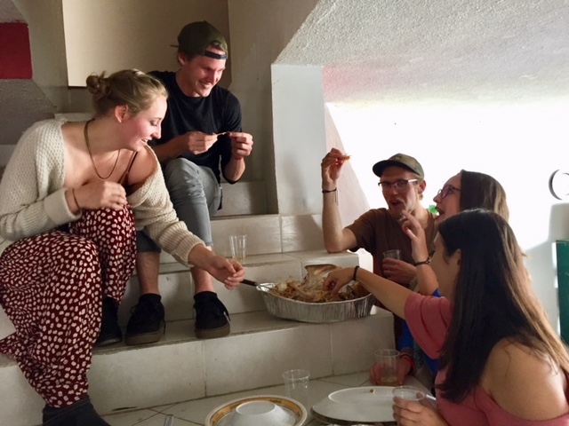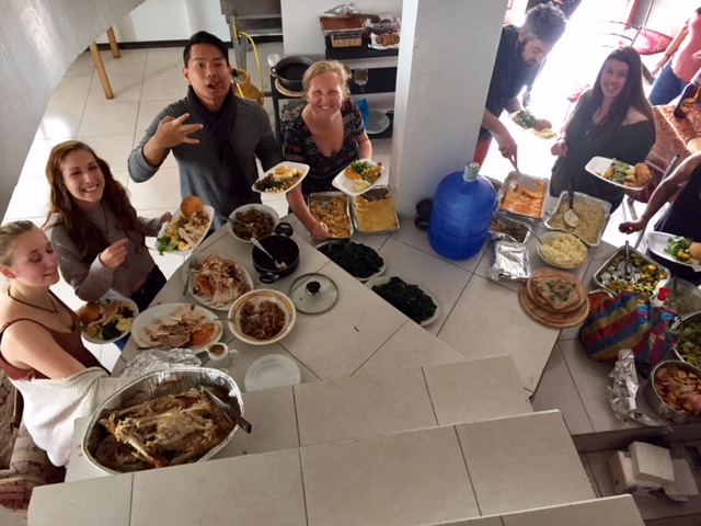 | The turkey didn’t even make it to the table and we were already picking! The most hilarious part of this scene was that we kept having to shoo the stray dogs back out the front door! |
