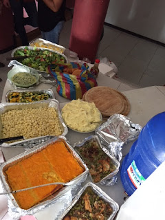 I see salad, deviled eggs, corn, mashed potatoes, shepherd’s pie, macaroni and cheese, roasted vegetables, swiss chard, and green bean casserole! Melissa (Virginia), Ava (Connecticut), Martha (Chicago), Megan (Chicago) and Makenzie (Iowa) are front and center to get a plateful.