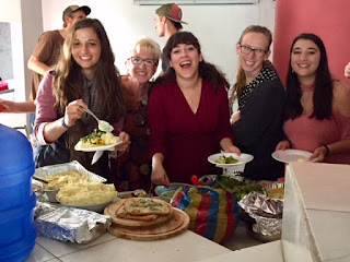 I see salad, deviled eggs, corn, mashed potatoes, shepherd’s pie, macaroni and cheese, roasted vegetables, swiss chard, and green bean casserole! Melissa (Virginia), Ava (Connecticut), Martha (Chicago), Megan (Chicago) and Makenzie (Iowa) are front and center to get a plateful.