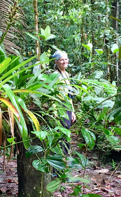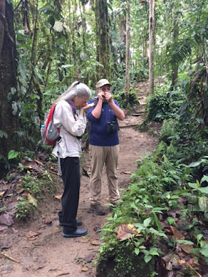 Here, Juniper is looking through a bird blind at the rare Tinamou in the trail.