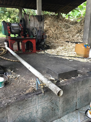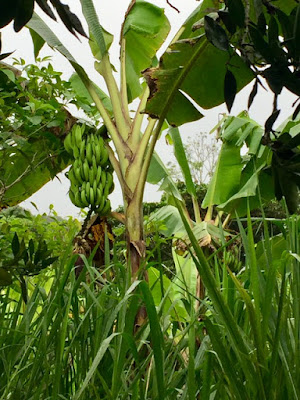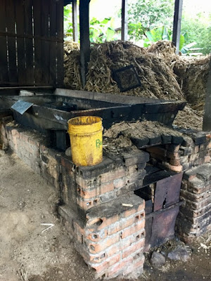 This is sugar cane growing with bananas. It perpetually grows, is cut periodically, and is smashed through a mill. The extracted sugar juice is then cooked down in large troughs over a wood fire.