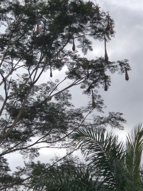 | High up in these trees, we spotted the nests of the Oropendula birds. |