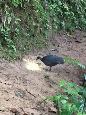 Here, Juniper is looking through a bird blind at the rare Tinamou in the trail.