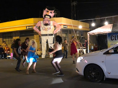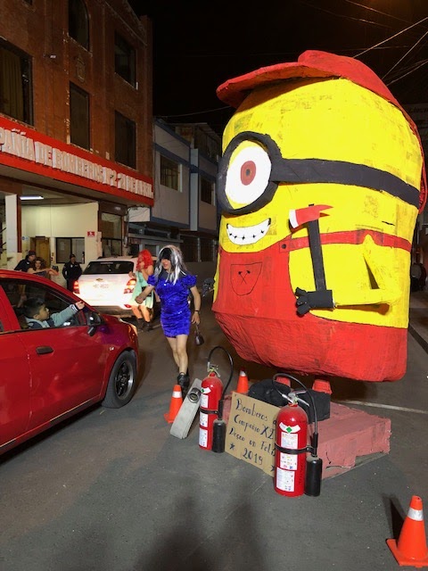 Throughout the city, the Viudas staked out a corner with a huge monigote to burn, and a giant set of stereo speakers blaring their dance music. Even the local fireman got in on the action with their personal monigote and their very own Viudas.