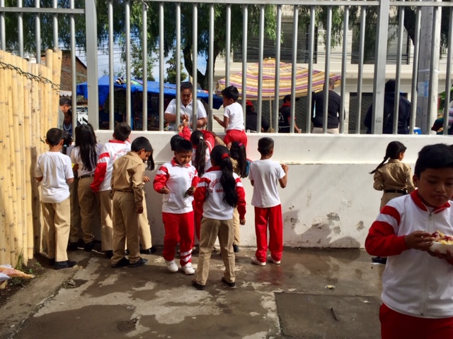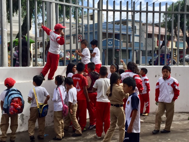 In the morning, school starts at 7am.  By the 9:00 recess, kids are scrambling (literally) for a snack.  Generally, students can’t leave campus, so the vendors line up outside the gates to sell their snacks to the students through the bars.  The kids clang on the bars and yell out what they want: salchipapas (french fries with a hot dog), colas or chips.  When the vendors’ trays get empty, they have to run back across the street to their restaurant to get another load.  It’s quite a scene at recess.