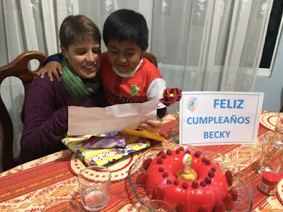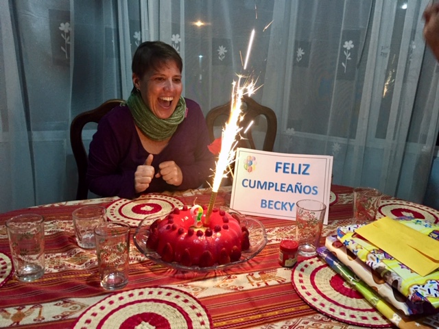 When I entered the house a little later, a beautiful breakfast of eggs and sausage, bread, fruit, and a bouquet of strawberry roses were waiting for me.  My Ecuadorian family sang to me and helped me start my special day.