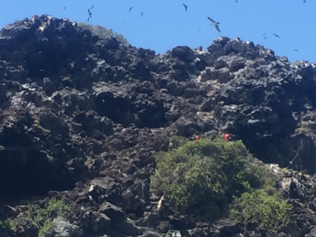| If you look closely, you’ll see the red puffed-up breast of the male frigate bird, attempting to attract a mate. |