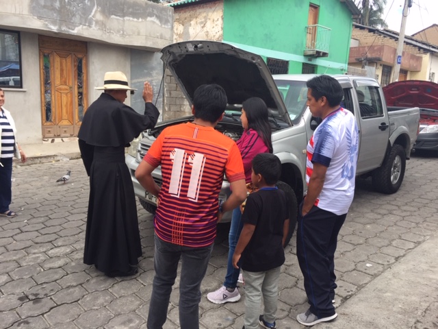 | Finally, it was our turn and the priest arrived with his bucket of holy water to sprinkle on the truck and say a prayer for the family and their safe travels. |