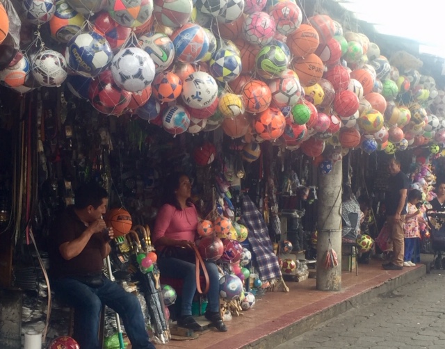 | Outside the Mercado, the streets are lined with all kinds of other vendors, including a whole section for toys and soccer balls. It’s Ecuador… everyone needs more than a few soccer balls! |
