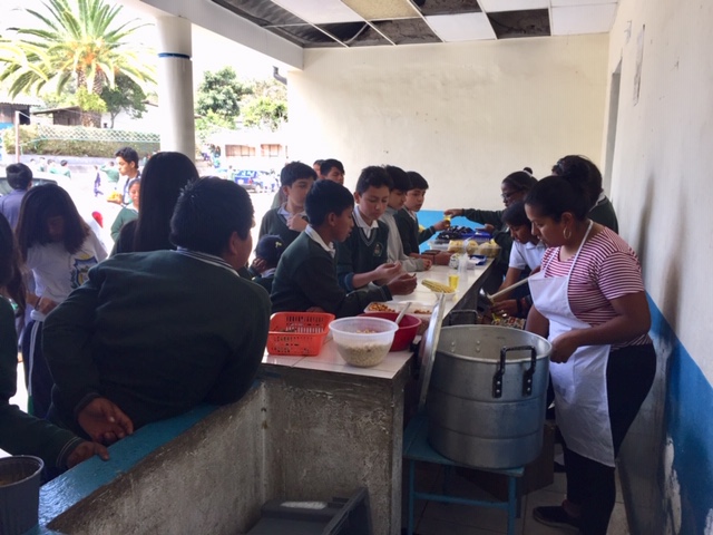 This is the student “snack bar”.  Since this school is so small, local “lunch ladies” are contracted to bring in huge pots and trays of food to sell during the morning snack break.  Usually they have a variety of bread and cheese sandwiches, rice with beans or hotdogs, jello, chips, fruit, or cakes.  The students take turns helping to sell the food as well.