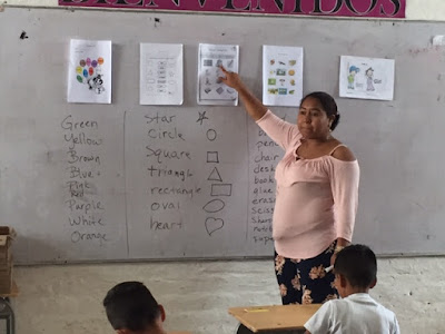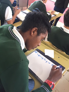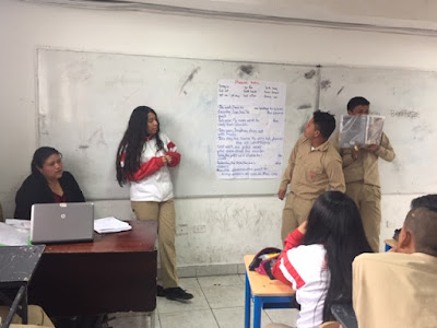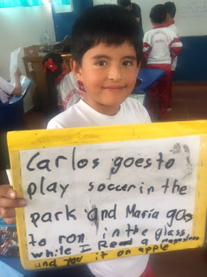 I brought the idea of personal whiteboards to this school, and Ernesto’s high school students have really seen the power and fun in this learning tool. Here, the 10th graders are demonstrating their knowledge of the Present Progressive Tense in English. I’m helping Ernesto think about how to engage “all of his students, all the time” with more whole class and partner speaking activities.