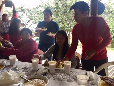But the food was great!  Chuleta (pork chops), chicken vegetable rolls with mushroom sauce, potatoes, rice, tostadas (toasted corn nuts), vegetable salad and avena (a thick oatmeal drink).