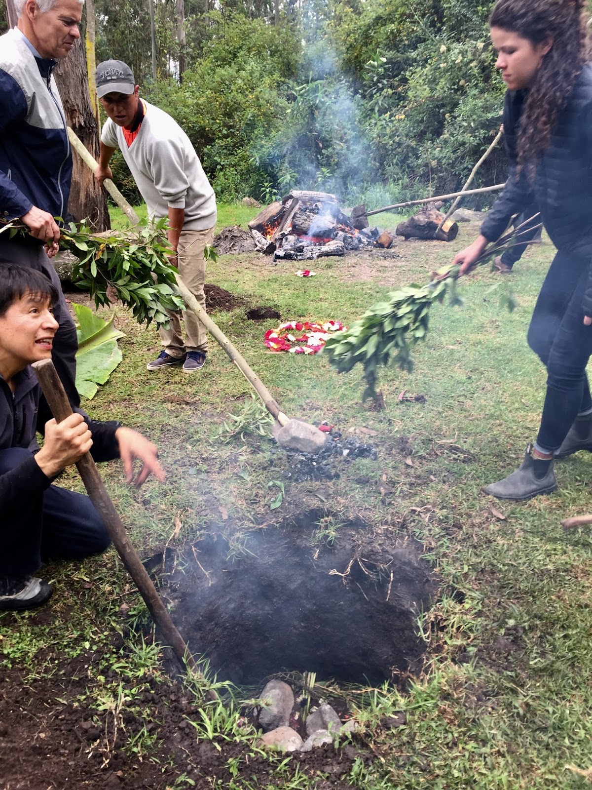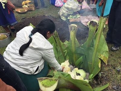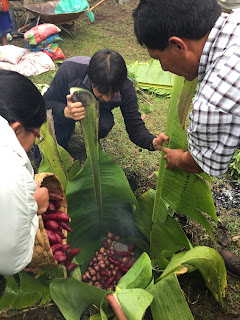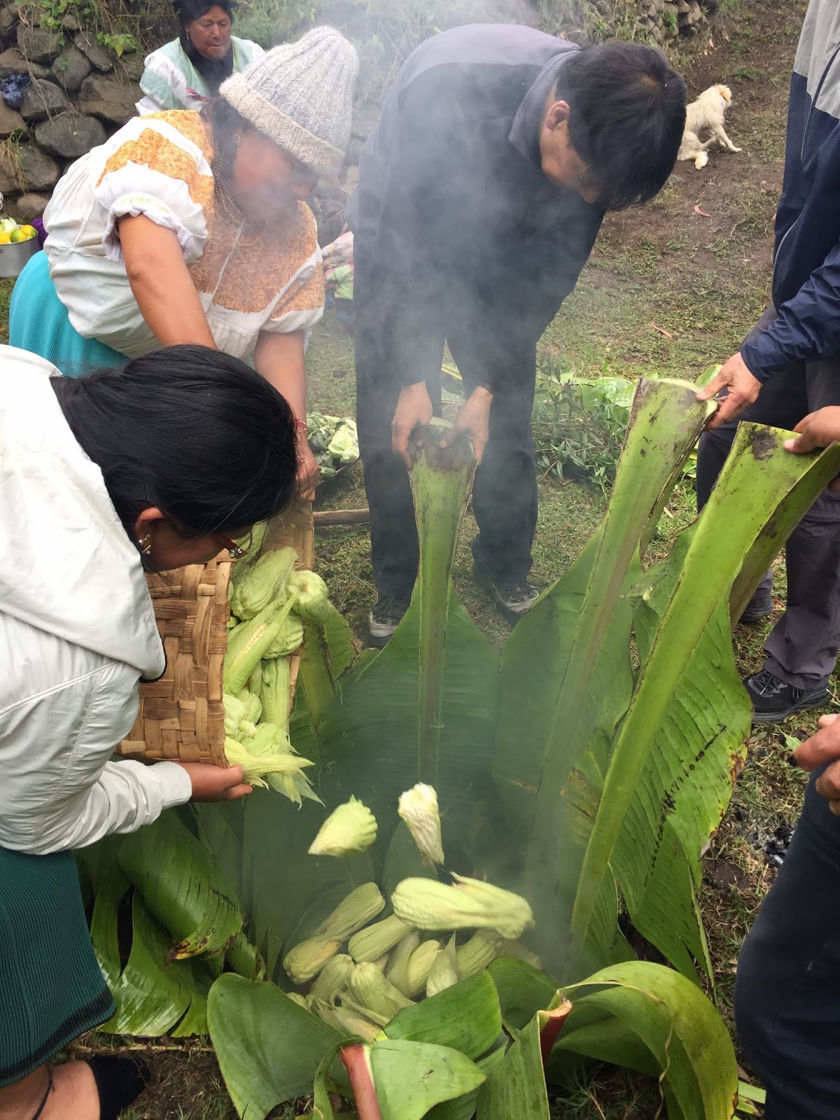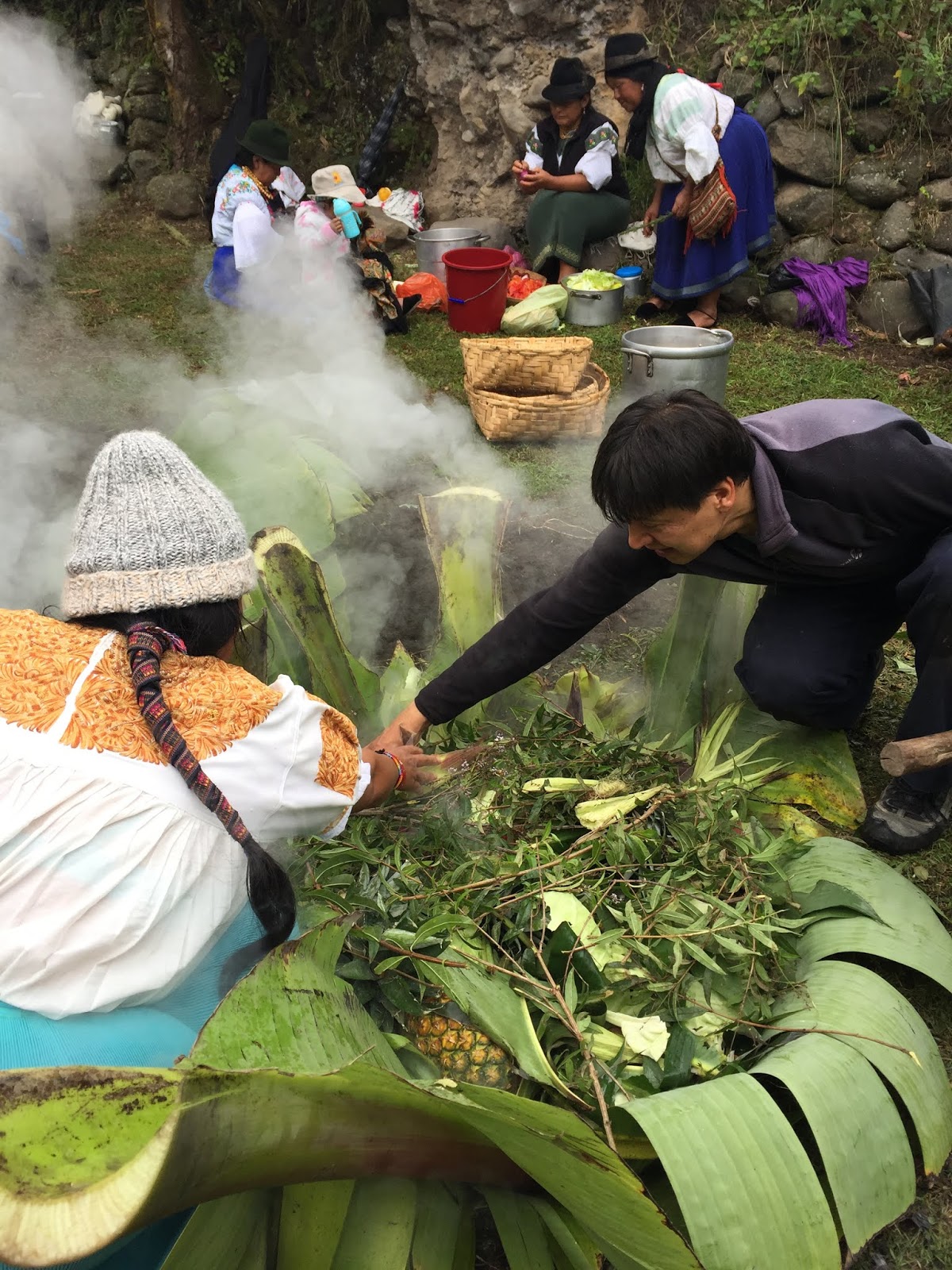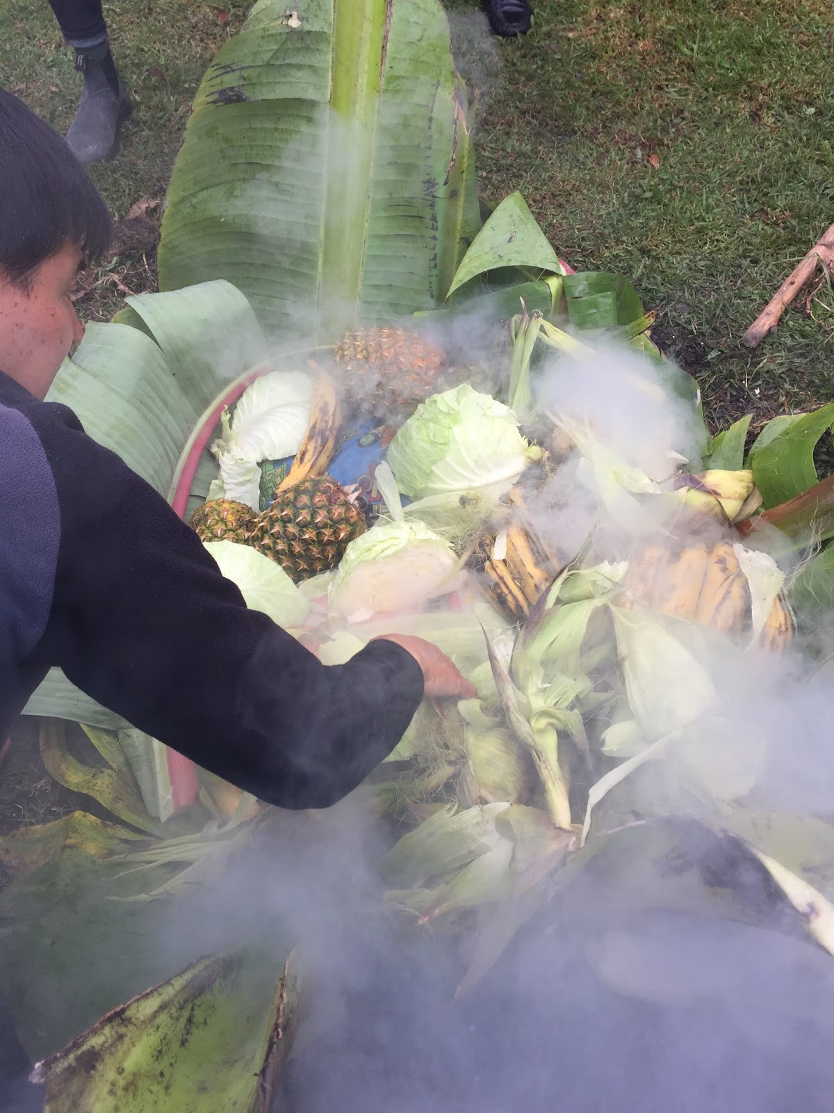 As each rock hit the bottom of the pit, a tremendous amount of steam roiled and the water started to boil. When the bottom was lined with rocks, large banana tree leaves were placed around the walls of the pit with the tops flopping out. I didn’t understand the purpose of these leaves until later. Next, the women started to pour baskets of the prepared vegetables into the pit. First the papas and camotes, the potatoes. Then choclo (corn on the cob) and bags of habas, or lima beans. At this point, it was decided that another layer of rocks were needed and the leftover corn shucks were added to keep the food from touching and burning directly on the rocks. The wrapped chicken packets, half cabbages, large heads of broccoli, large plátanos, whole piñas (pineapples) and more hot rocks were layered into the pit.