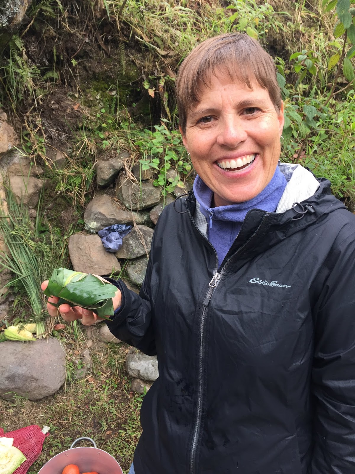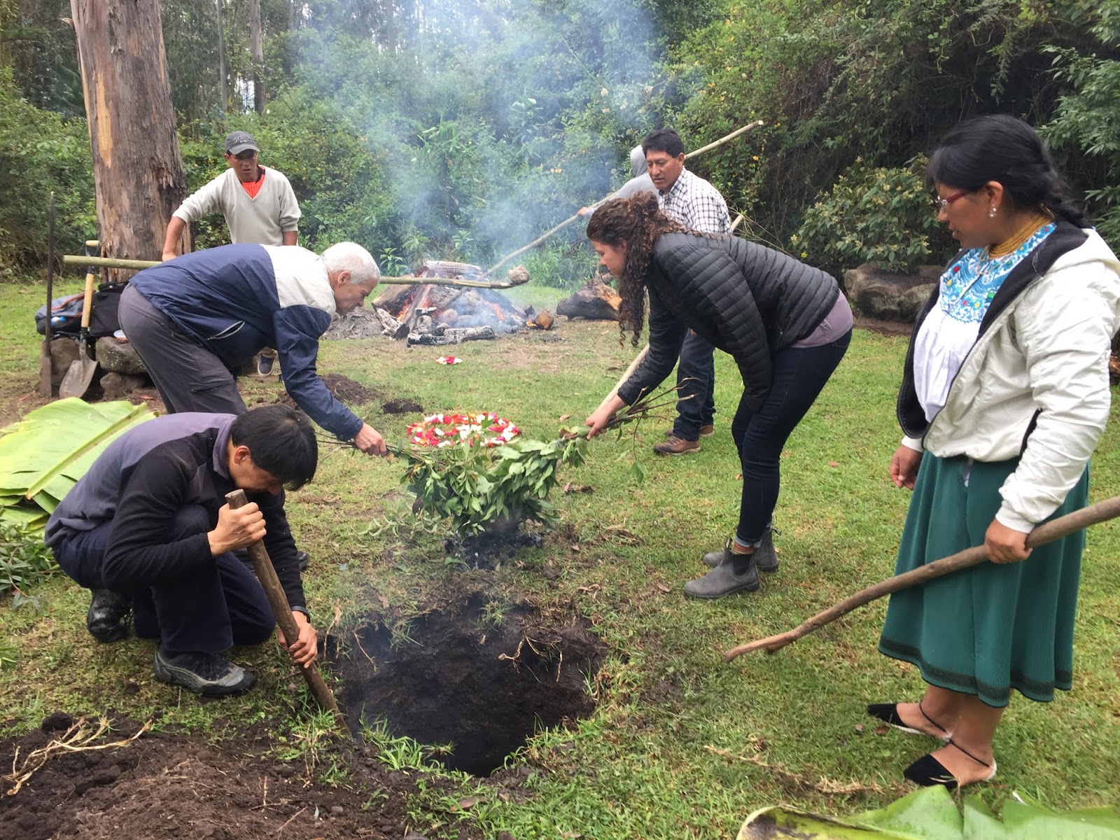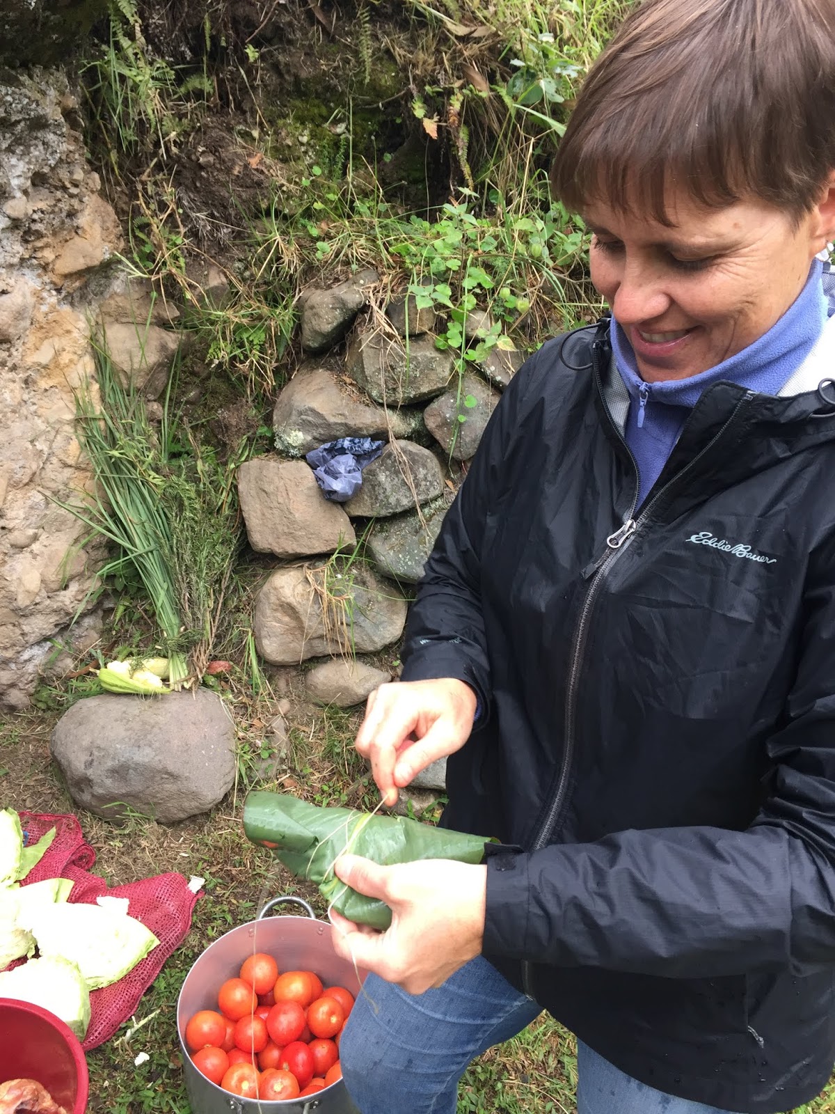 As each rock hit the bottom of the pit, a tremendous amount of steam roiled and the water started to boil. When the bottom was lined with rocks, large banana tree leaves were placed around the walls of the pit with the tops flopping out. I didn’t understand the purpose of these leaves until later. Next, the women started to pour baskets of the prepared vegetables into the pit. First the papas and camotes, the potatoes. Then choclo (corn on the cob) and bags of habas, or lima beans. At this point, it was decided that another layer of rocks were needed and the leftover corn shucks were added to keep the food from touching and burning directly on the rocks. The wrapped chicken packets, half cabbages, large heads of broccoli, large plátanos, whole piñas (pineapples) and more hot rocks were layered into the pit.