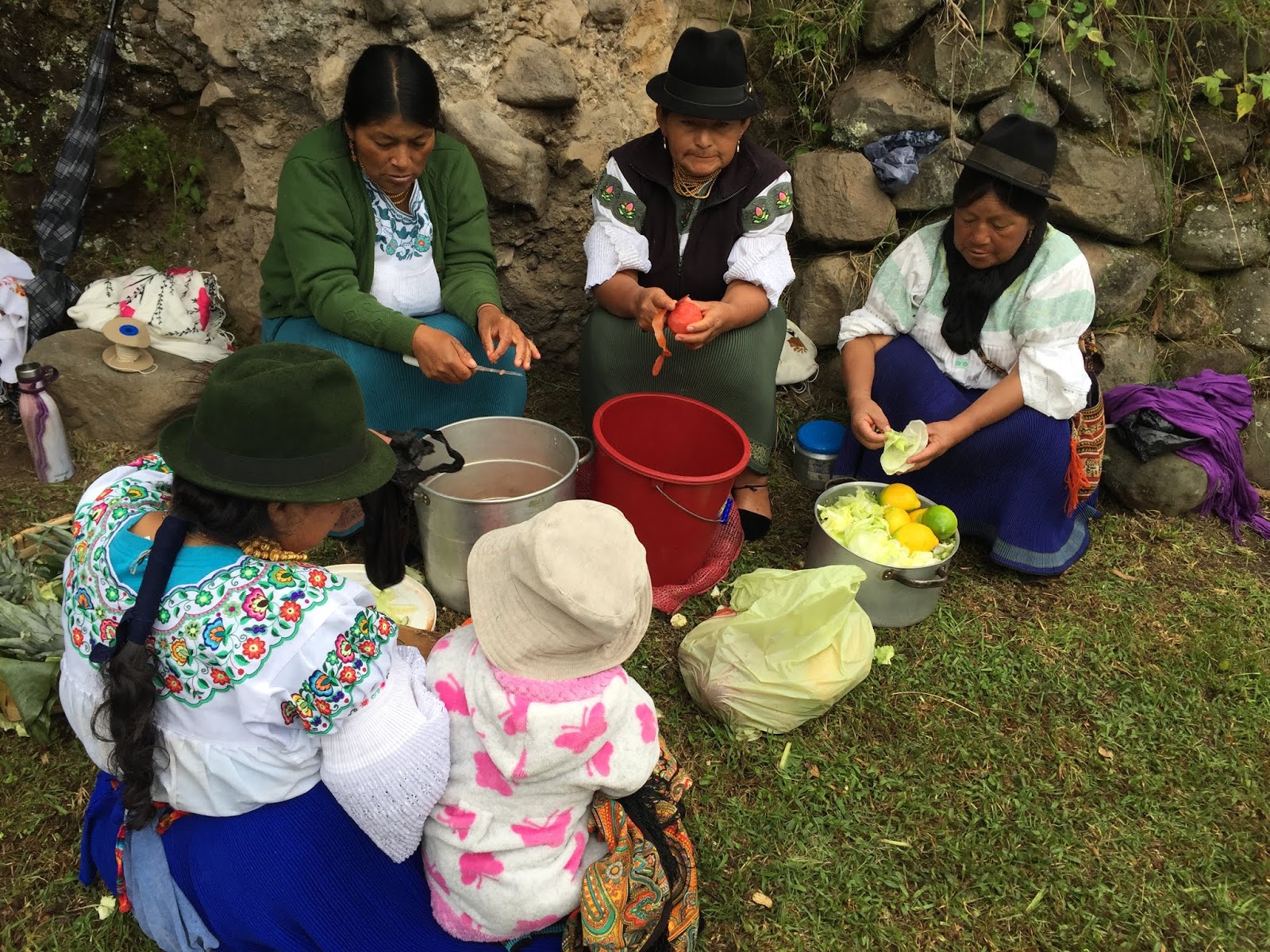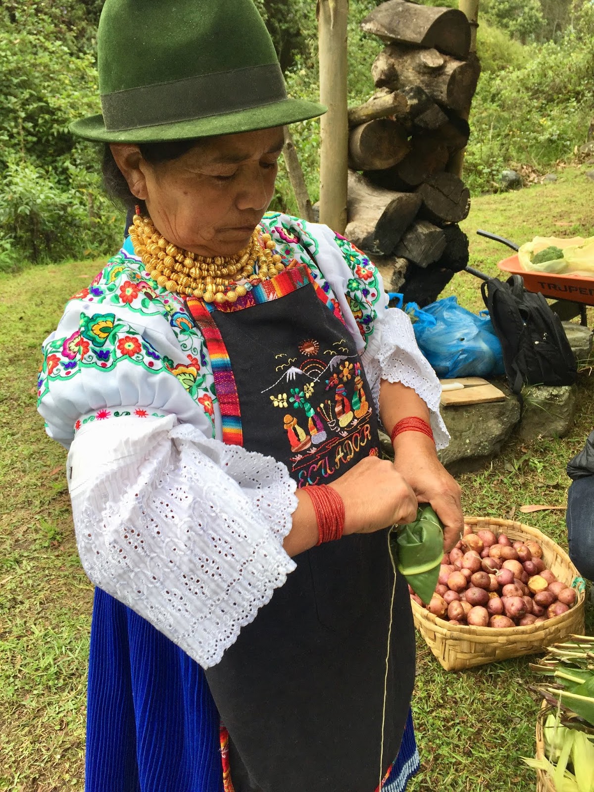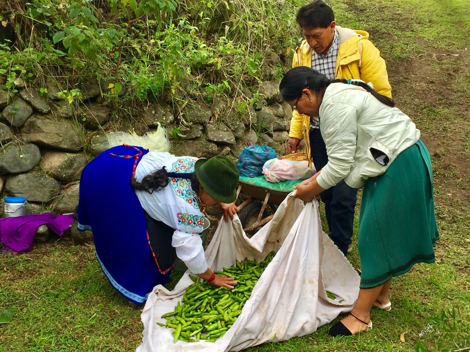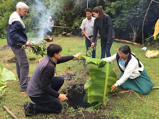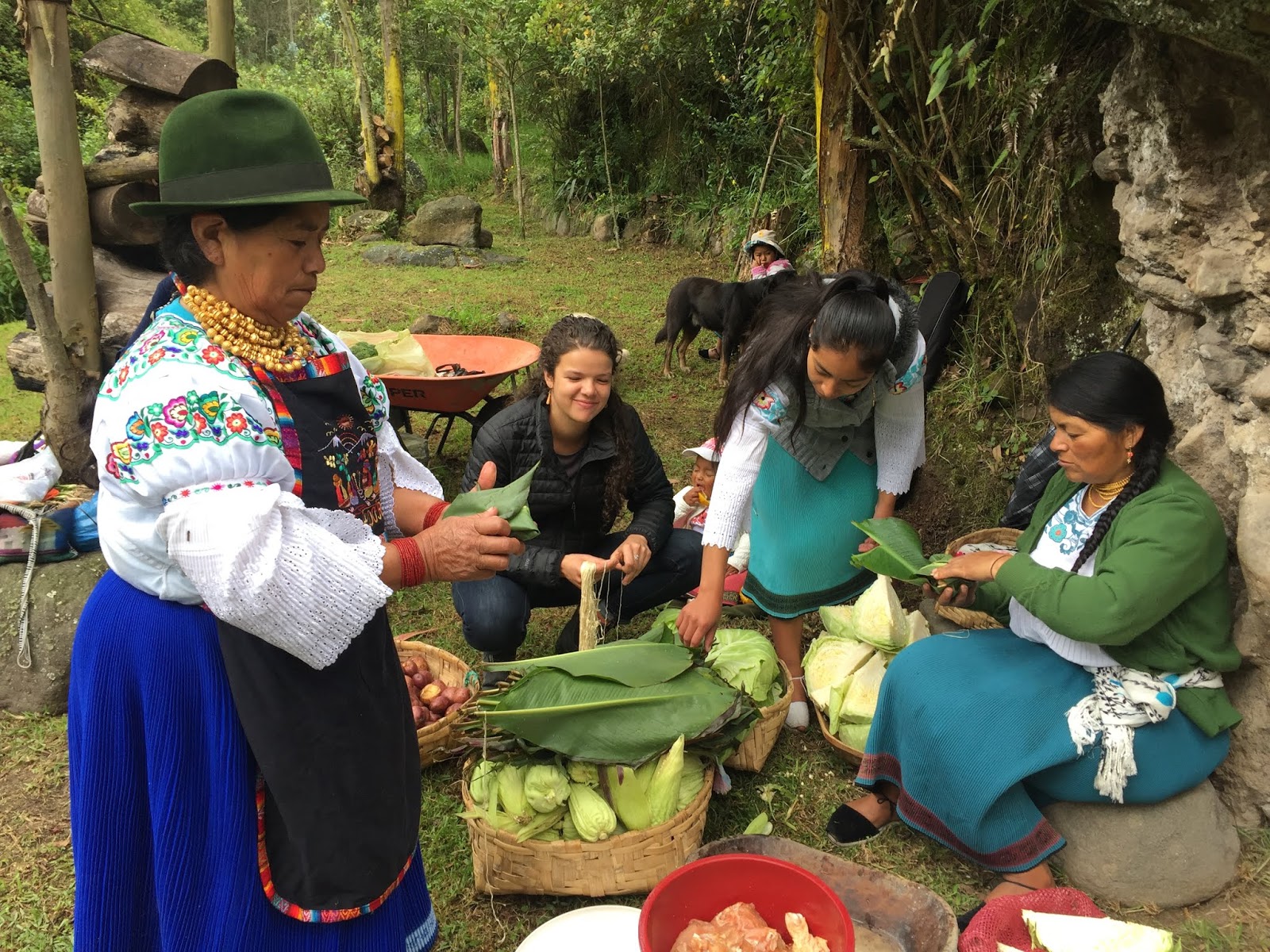 As each rock hit the bottom of the pit, a tremendous amount of steam roiled and the water started to boil. When the bottom was lined with rocks, large banana tree leaves were placed around the walls of the pit with the tops flopping out. I didn’t understand the purpose of these leaves until later. Next, the women started to pour baskets of the prepared vegetables into the pit. First the papas and camotes, the potatoes. Then choclo (corn on the cob) and bags of habas, or lima beans. At this point, it was decided that another layer of rocks were needed and the leftover corn shucks were added to keep the food from touching and burning directly on the rocks. The wrapped chicken packets, half cabbages, large heads of broccoli, large plátanos, whole piñas (pineapples) and more hot rocks were layered into the pit.