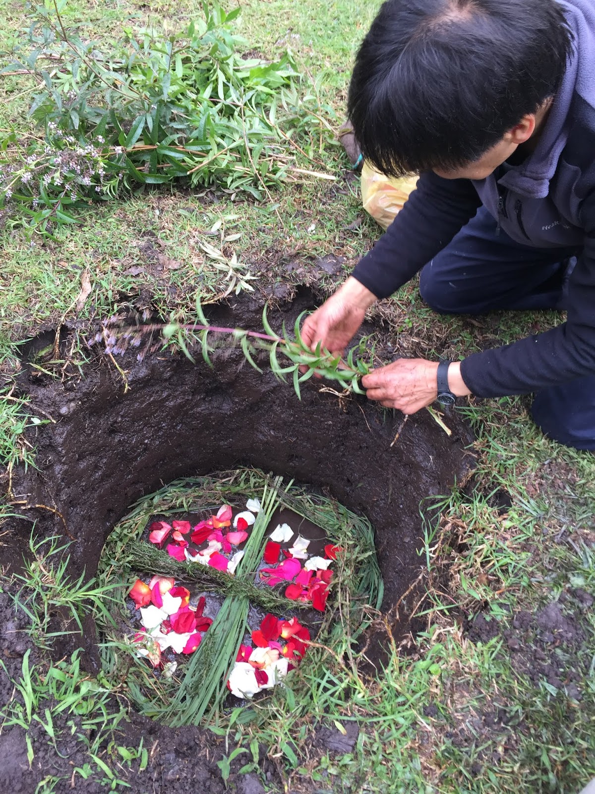 Flower petals were lovingly placed in a spiral on the mound. |