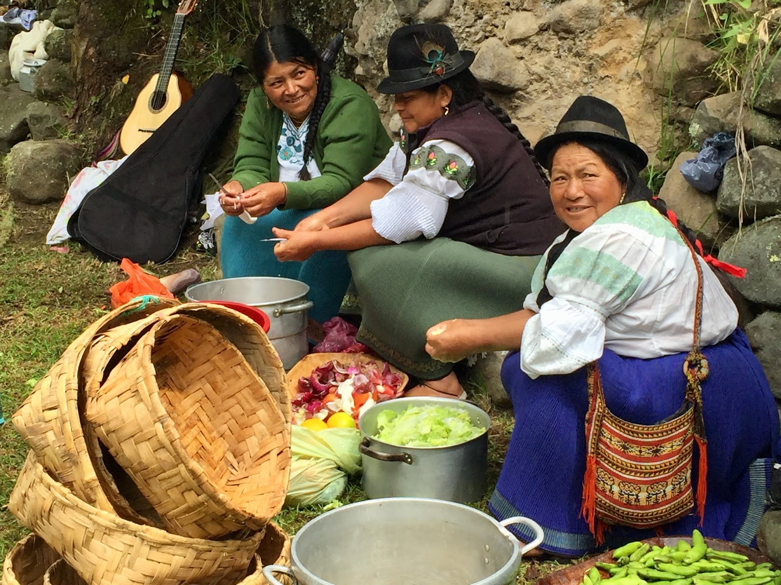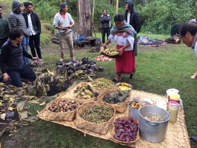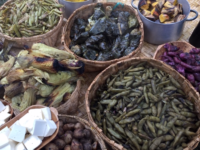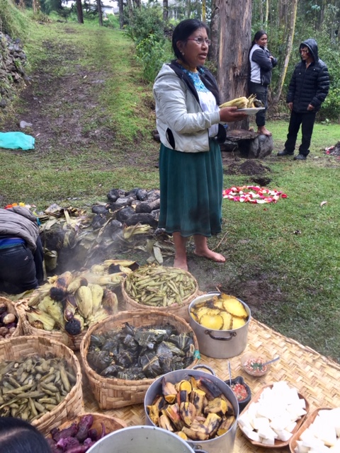 Pictured in this photo are baskets of habas, packets of pollo, a pot of plátanos, camotes, papas and choclo with some queso freso cheese. |