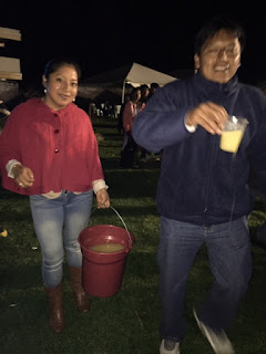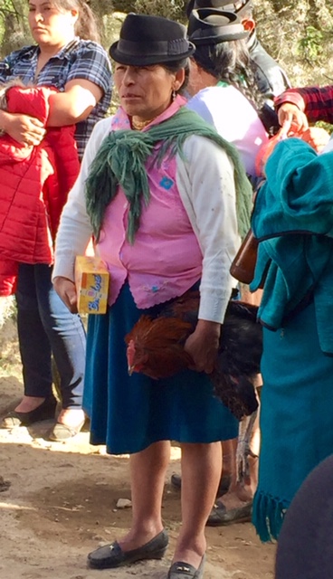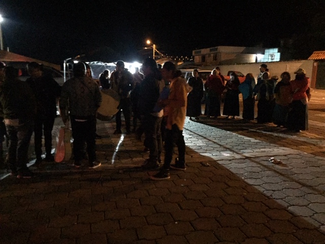 As I said, Jose gets invited to a lot of San Juan Festivals.  One evening at about 8pm, he said “Vamos!” and we were off to the tiny pueblo of Gonzalo Suarez.  When we arrived, several people greeted him in the streets to welcome “Ingenerio Angamarca”.  They were so excited he arrived.  He must have electrified their futbal field.  Then, he and Margarita were given the honor of carrying the bucket of chicha, a fermented corn drink, to pass around to the crowd.  The large futbal stadium was full of both women and men dancing.  But, in this barrio, I also saw a group of women standing off to the side watching the men dance.  Some Indigenous communities, as Jose explained, have very strong macho or chauvinistic roles and only the men are allowed