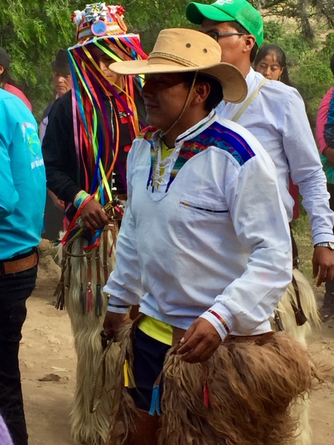 The rainbow colored two-faced Huma mask is a main character throughout Inti Raymi and San Juan celebrations.  The two faces are a yin-yang character inviting positive spirits while warding off negative ones.  This character usually leads and adds fun to the revelry.  The chaps, or chivos, with the whip are also an important part of the tradition.  Originally worn by the managers of the haciendas when the Indigenous were made to work like serfs, now these traditional pants are worn by the Indigenous (or anyone else playing the part) to symbolically show that they now hold the power.