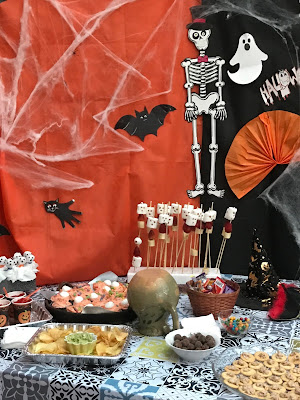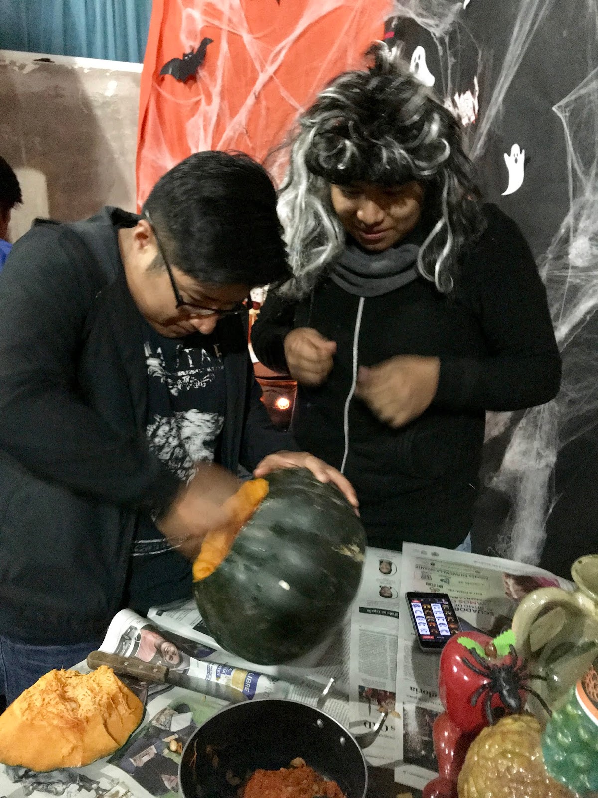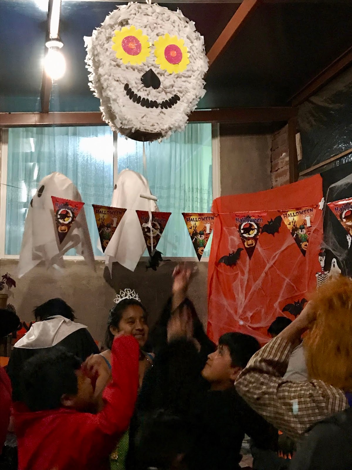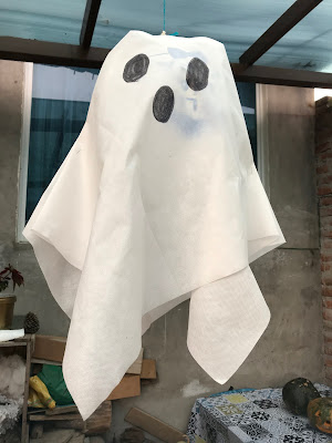 Then, we worked all month to create a variety of decorations for our outdoor patio. Luckily paper and crepe paper are easy to come by in this country and we even found some stretchy spider-webbing at a costume shop.