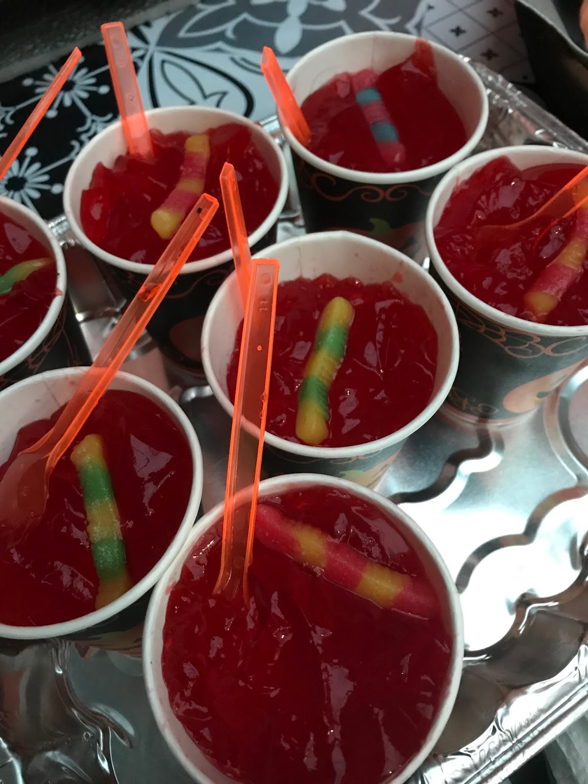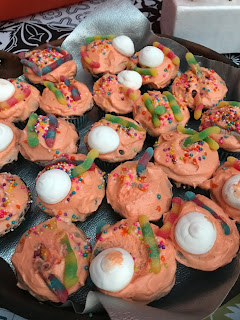 Geletin is a common drink here, so we “scarified” it with some gummy worms. Then we decorated chocolate cupcakes (not so common here) with worms and marshmallow eyeballs.