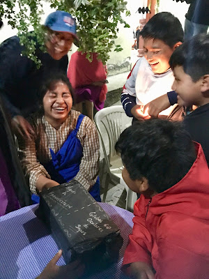 | They don’t use bats to pummel their piñatas here in Ecuador. They smartly have a pull cord attached to a trap-door at the bottom of the piñata. The candy flies, and piñata is still intact. |