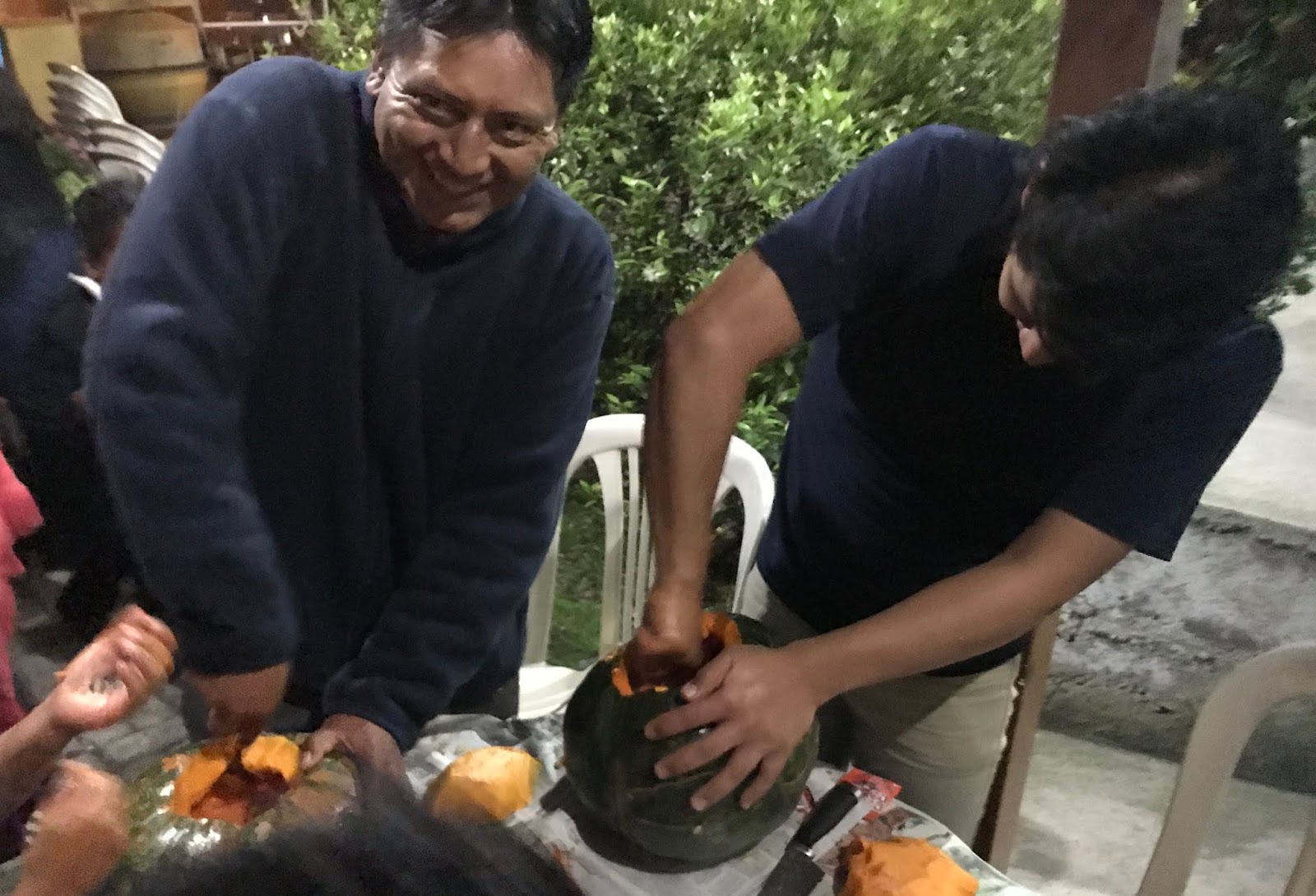 After the majority of guests arrived and played my Pin-the-Tail-on-the-Cat game, I introduced them all to the art of carving a squash. I had to search the mercado for six good-sized squash to carve, and then negotiate with the vendor. All six for $20, and the bag to carry them for free, thank you! She thought I was crazy, but I bet she was glad to not have to carry them home. They were heavy!
