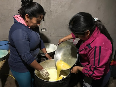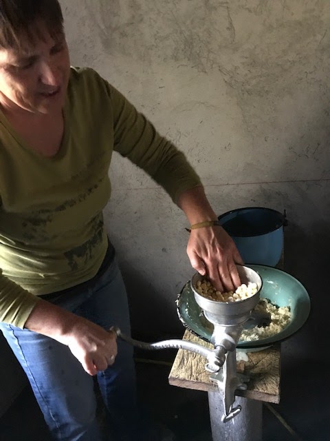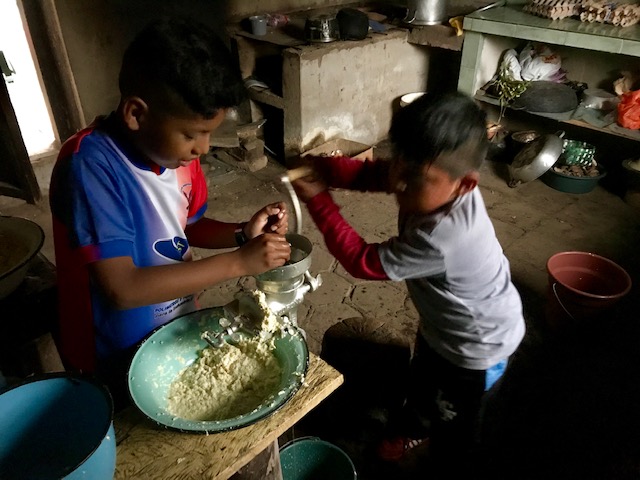 Step 4: Two adults and two children wash and grind the kernels in a traditional molino, or mill.