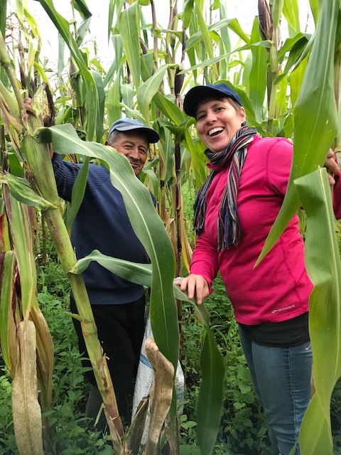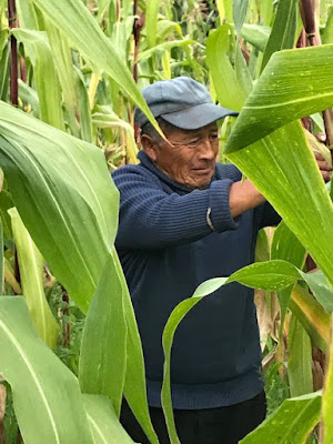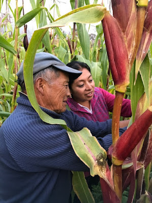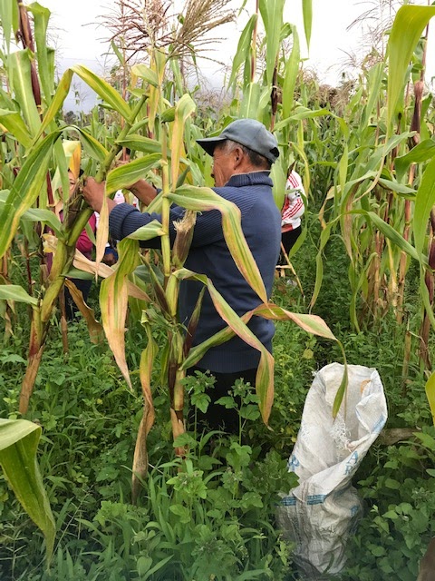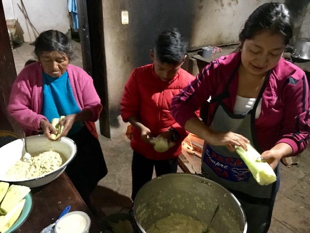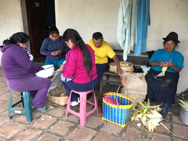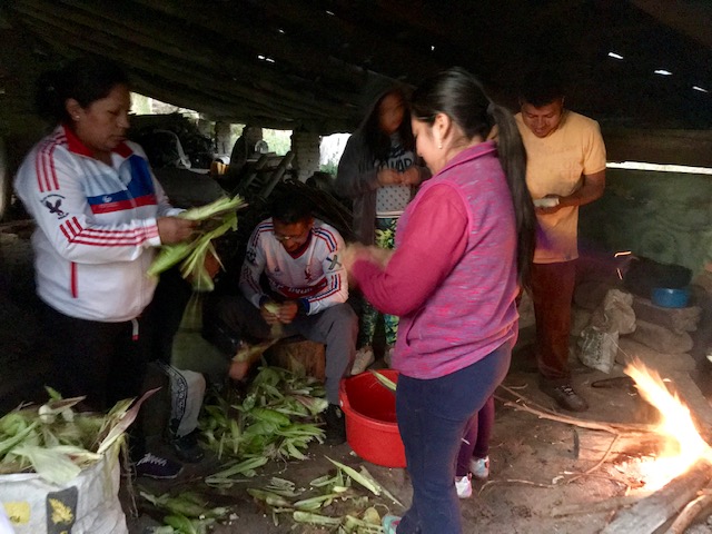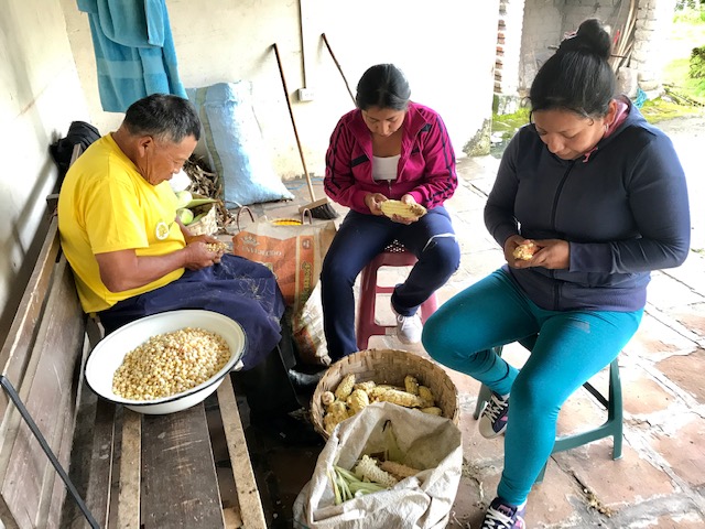 | Margarita, Faby and Jose’s sister Veronica help Victor and Josefina with the corn. |