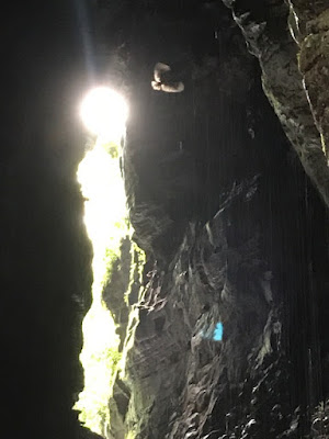As part of my day-trip, Edison took me to another interesting attraction: La Gruta de Los Tayos. A gruta is a cave with an opening at both ends, more like a tunnel. Tayos are known as Oilbirds. These birds are nocturnal and nest in caves or grutas, but will flutter about when disturbed by somebody walking into their space. I think this gruta is officially located in the National Park, but the trails to access it are on land owned by a local family. They charged me a couple of bucks to “guide” me to the gruta and teach me about the ecosystem, and their efforts to preserve their little paradise. To get there, I was told that I had to hike down a steep trail into a canyon.