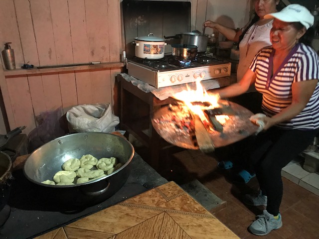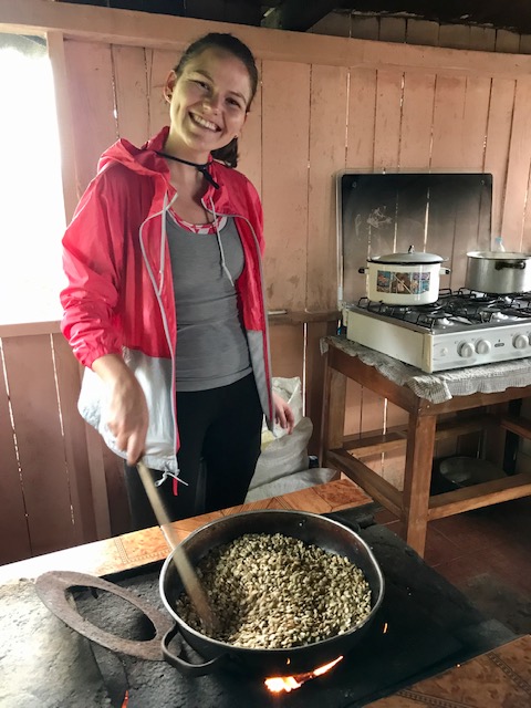 While we stepped outside the kitchen and took turns hand grinding the coffee beans to powder, Germania and Maria began to cook the Pan de Yuca. Germania decided to cook the bread in a special manner for a “different flavor”. First, she placed the formed bread rolls into a large metal pot and placed that over a small wood fire. A jumble of burning branches were then loaded on top of its metal lid. I don’t know if it was this type of “dutch-oven” cooking method or the pig fat in the bread, but it was the most amazing bread I have ever had the pleasure to eat. To be honest, I forget what else was for dinner besides that amazing Pan de Yuca and fresh field-to-table coffee.