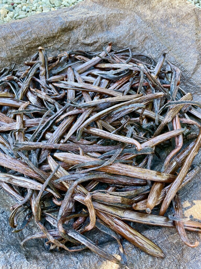 After the pods are harvested, they are dried and cured which causes them to naturally produce vanillin, the compound that gives the bean pods its flavor and scent.