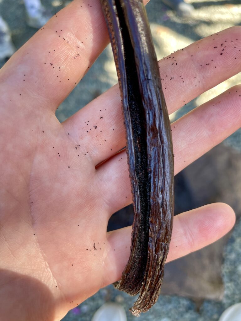 Along the tour, I learned that vanilla is the only orchid plant that produces an edible flower, it is native to Central America and Mexico, and is considered the most popular flavor in the world. Vanilla is quite expensive because cultivating and processing it is very labor intensive. Each vanilla plant only blooms for one morning, once per year. When this happens on a vanilla plantation, which aims for 100% success rate, workers need to be ready to manually pollinate the flower. The pods that form take nine months to grow and they are manually harvested when they turn yellow or reddish in color.