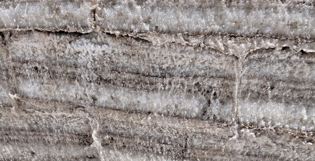 The surface of the Salar sits at about 12,000 feet above sea level and is predominantly made up of sodium choloride (salt) with a brine underneath that contains boron, magnesium, potassium and massive reserves of lithium. During the rainy season, rain water and water flowing in from nearby rivers forms a shallow layer of water on the top of the Salar. It eventually seeps into the crust which dissolves the salt. Then as the water evaporates, the salt settles into a crystallized crust again. This cycle repeats itself annually making distinct lines or layers in the cross-section of the salt.