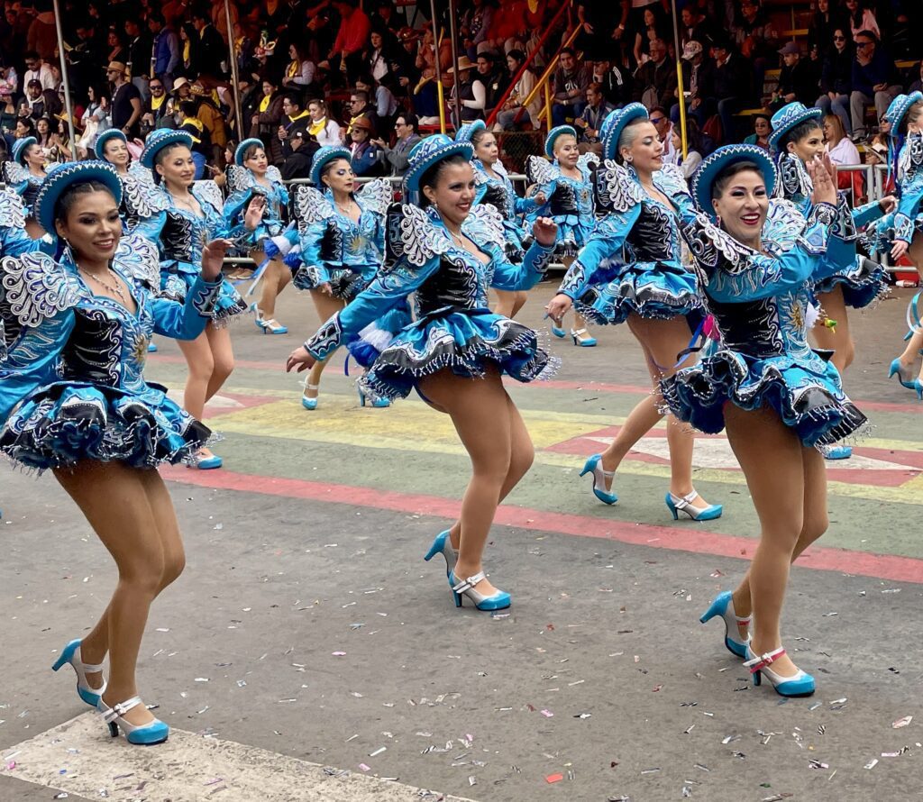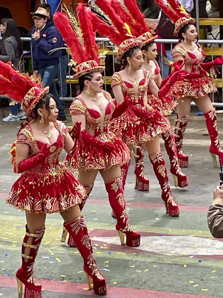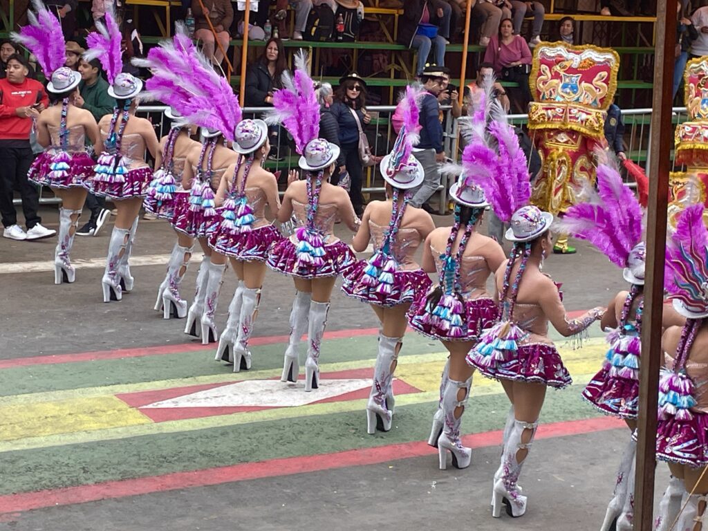 Historically, women were not allowed to dance in Carnaval parades, so men dressed as women played the female roles. Sometime in the 1970’s, women were allowed to enter the parade as the female slaves and were dressed very conservatively. Older traditional women still dance with these styles of dresses. But as times have changed, the female participants have gotten younger and the skirts have gotten shorter and more fancy. The dance they perform, however, hasn’t changed. For more than three kilometers along the parade route, they walked moving their arms and legs to a slow and rhythmic drum beat using a repetitive, robotic motion in a dance called the Morenada. It represents the ceaseless labor of the slaves who worked in the mines.